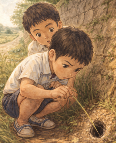 穴の前で、息を殺していた 校庭の隅、石垣の下、畑のあぜ道土が少し盛り上がってい... -